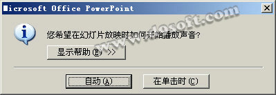 這時系統會彈出對話框,詢問“您希望在幻燈片播放時如何開始播放聲音”,單擊“自動”以便顯示幻燈片時播放聲音,此時幻燈片上有一個“喇叭”圖標出現;