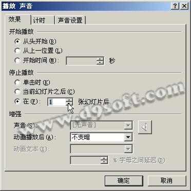 在“效果選項”設置頁面,“停止播放”的默認選項是 [單擊時] ,根據你的需要,想讓背景音樂在“X”張幻燈片內存在,就在“停止播放”選項中選擇“在X 張幻燈片后”,其中 X 代表你想要背景音樂持續存在的幻燈片數量。