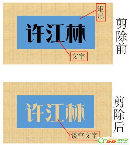 這里我們來(lái)演示一下,如何從矩形中“摳”出文字來(lái),就像鏤刻一樣。在文本框中寫(xiě)好字,然后制作一個(gè)比文字大的矩形,把文字放入矩形中。這時(shí),先選中矩形,然后按住Ctrl鍵,再選中文字,單擊“剪除”功能按鈕,立馬就在矩形內(nèi)鏤刻出文字。這個(gè)效果在2013版本以前很難做到,現(xiàn)在則輕而易舉。