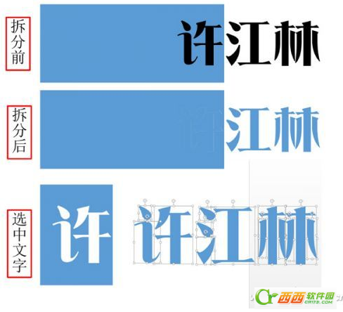 把文字?jǐn)[在矩形或其他形狀上,先選矩形然后再選文字,接著單擊“拆分”功能按鈕,然后我們驚喜地發(fā)現(xiàn),文字被拆成了一個(gè)個(gè)的形狀了。