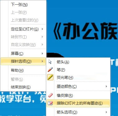 4、但是你如果要恢復(fù)到原來(lái)的PPT幻燈片,可以在右鍵彈出的菜單中選擇“指針選項(xiàng)”中的“擦除幻燈片上的所有墨跡”命令。做的這些標(biāo)記不會(huì)修改幻燈片本身的內(nèi)容。
