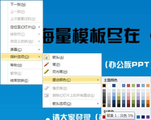 2、如果你對(duì)圖筆的顏色不感興趣,還可在右擊幻燈片時(shí)彈出的快捷菜單中選擇“指針選項(xiàng)”命令,再選擇“墨跡顏色”,選擇你喜歡的顏色。