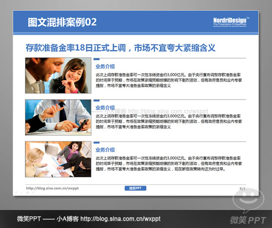 頁面保留了商務ppt的特性,規(guī)規(guī)矩矩。3張圖分別對應圖上3條內(nèi)容信息。但PPT排版的問題,使得圖片與內(nèi)容缺乏呼應,頁面大有“為了放圖而放圖”的感覺,缺乏指向性。