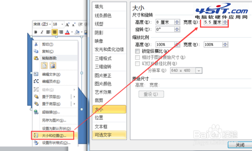 3、把復制出來的這12個三角形的寬度依次縮小0.5。方法是右鍵單擊某一個三角形,選擇“大小和位置”,然后在“設置形狀格式”對話框中把更改寬度的數值。如圖所示: