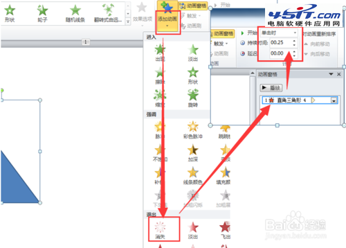 8、從最上層開始為三角形添加消失動畫,動畫參數如圖所示,除了第一個動畫開始方式為單擊,其它的開始方式都設為“上個動畫之后”。