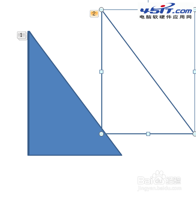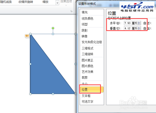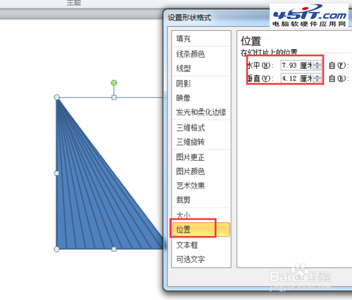 4、讓所有的三角形兩直角邊對齊,為了能達到精確對齊,可以通過“設置形狀格式”對話框設置精確的位置,使所有三角形直角邊和直角頂點對齊。圖所示: