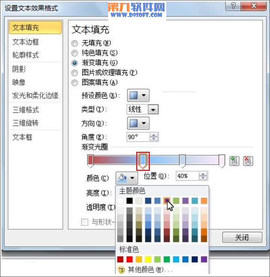 ②彈出設(shè)置文本效果格式對(duì)話框,在文本填充中勾選漸變填充,預(yù)設(shè)顏色選為雨后天晴這款樣式,如下所示。