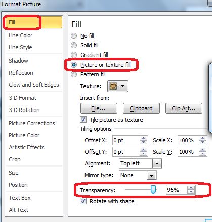 3. 到Fill - > Picture or Texture fill - > Transparency 調整到合適的程度即可。