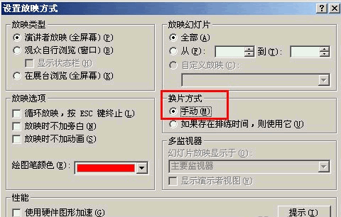 在“換片方式”中,將“如果存在排練時間,則使用它”前面的選項改成“手動”,點“確定”返回即可。