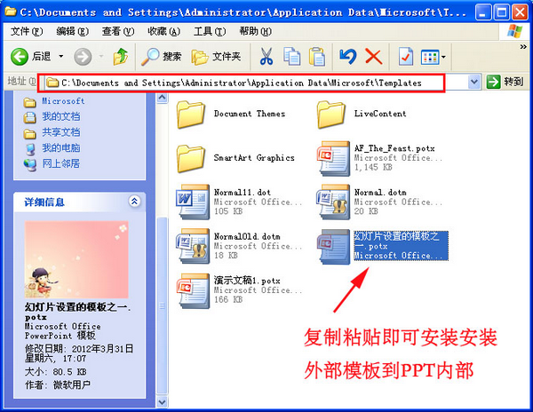 將外部模板安裝為powerpoint內(nèi)部模板:模板是以文件的形式存放的。因此,如果從網(wǎng)上或光盤上找到一些ppt模板,只要把它們復(fù)制粘貼到C:Documents and SettingsAdministratorApplicationDataMicrosoftDataMicrosoftTemplates文件夾下,不過需注意Office 2007/2010能夠識別*.pot和*.potx兩種格式的模板。