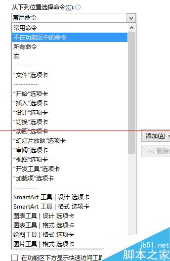 3、進(jìn)入“自定義功能區(qū)”,并選擇“不在功能區(qū)的命令”。