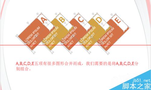 1、插入圖形后,發現A,B,C,D,E五項有很多圖形合并而成,我們需要的是將A,B,C,D,E分別組合。