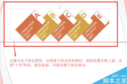 2、左鍵點擊下組合圖形,出現真個組合的外框時,鼠標放置外框上面,出現“十字”形狀,按住鼠標,可拖動整個組合移動。