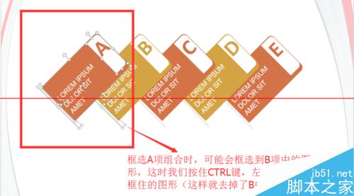 2、框選A項進行組合,這時我們可能會框選到B項中的圖形,這時我們按住CTRL鍵,左鍵點擊下B項中框住的圖形(這樣就去掉了B中圖形)