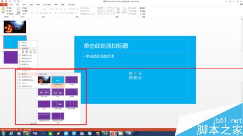 點擊左側縮略圖,右鍵→版式。可以看到,通過母版設置的新背景已經出現在選項中。通過點擊選擇自己需要的版式即可進行編輯。
