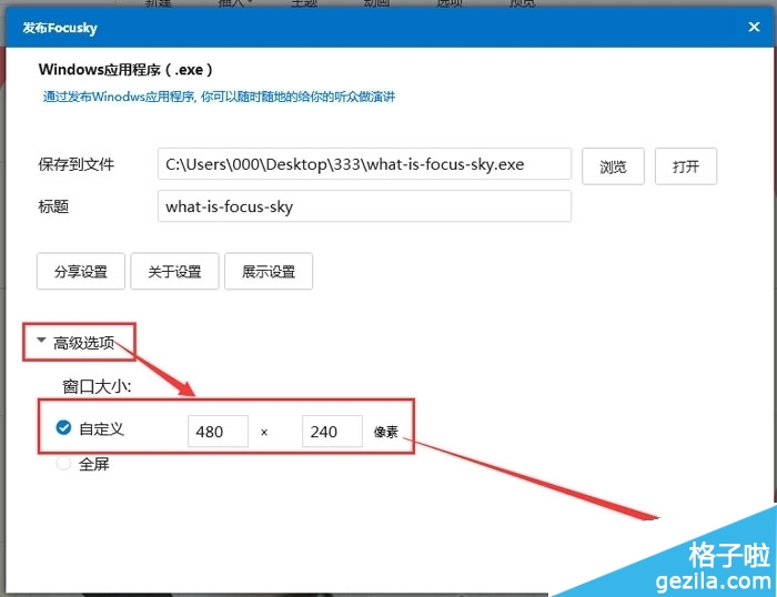 2. 點擊“高級選項”,會見到被隱藏的窗口大小選項,默認狀態是全屏,那我們點選“自定義”,輸入需要設置的大小,最后點擊發布,就完成了。