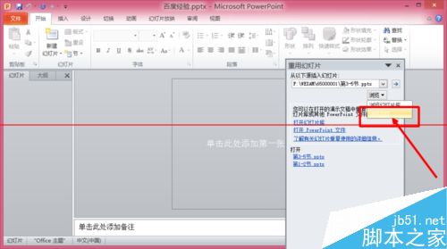 4、點(diǎn)擊“重用幻燈片”,點(diǎn)擊“游覽”,選擇“游覽文件”