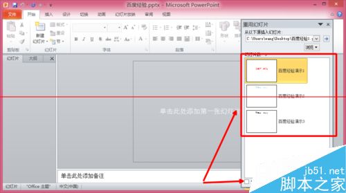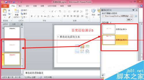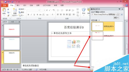 6、同樣的方法,點(diǎn)擊“重用幻燈片”,打開“百度經(jīng)驗(yàn)2”,選擇“保留原格式”,雙擊即可出現(xiàn)