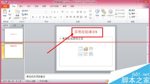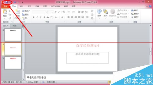 3、打開新建的“百度經(jīng)驗(yàn).pptx”,我們點(diǎn)擊“開始”,選擇“新建幻燈片”下的三角圖標(biāo)