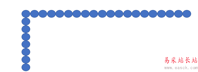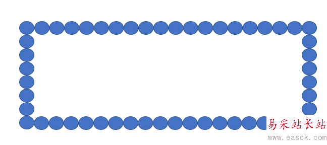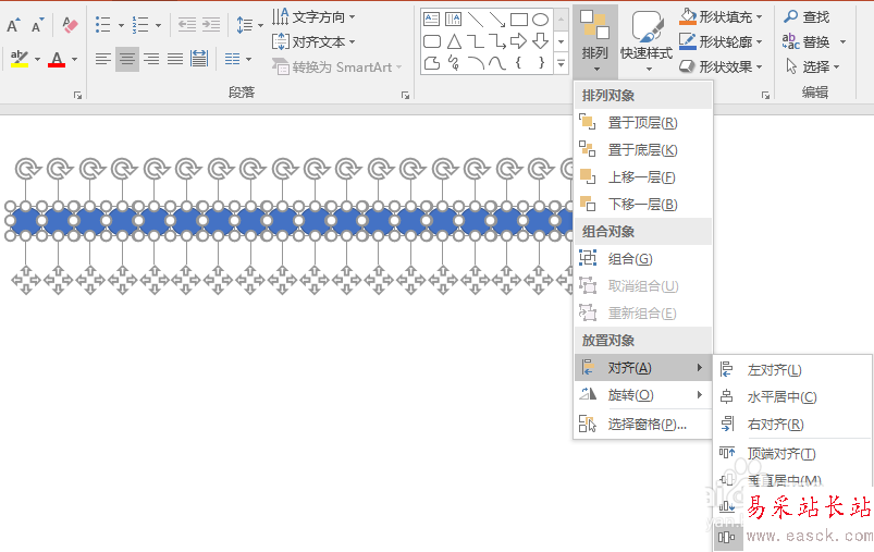 1、我們先用插入菜單里的圓形狀畫出一個小圓,然后多復制幾個小圓,做出一排像圖示這樣緊密相連的小圓,這里我們可以使用水平橫向分布、頂端對齊,來使小圓排列整齊。