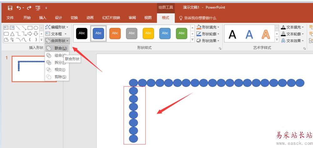 3、選中豎排的小圓(除了第一個小圓不要選),如圖所示,點擊合并形狀——選擇聯合,使它成為一個整體。