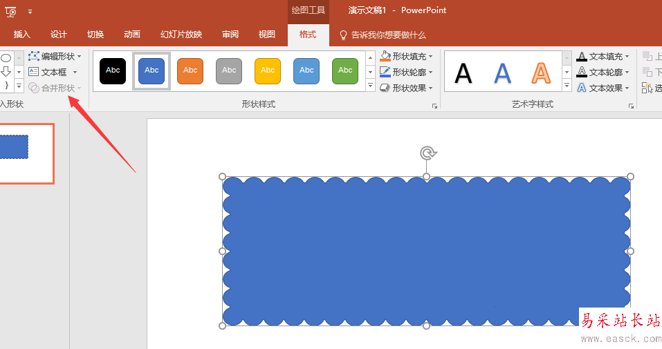 6、然后畫一個矩形,將長寬拉到合適的大小,如圖所示。全部選中,點擊合并形狀——選擇聯合。這個時候就基本完成了,我們可以替換顏色隨你喜歡。