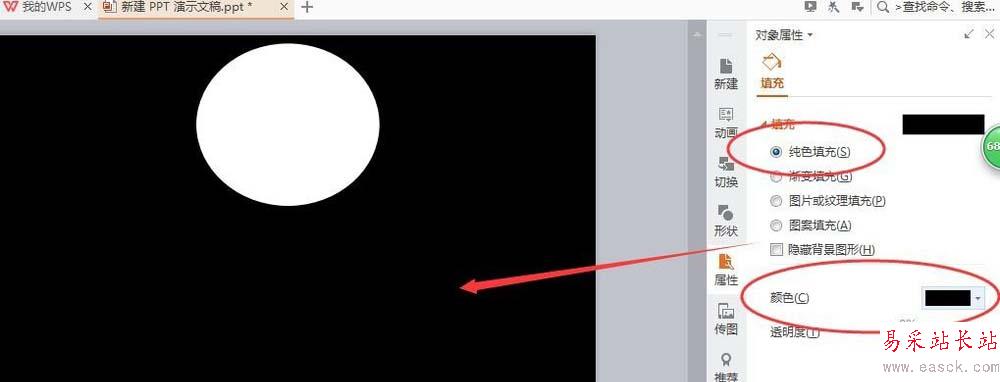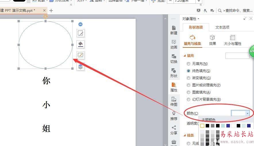 3、在設置這個形狀的屬性,填充成白色,選擇無線條把這個圓形變成一個透明寫圓形形狀