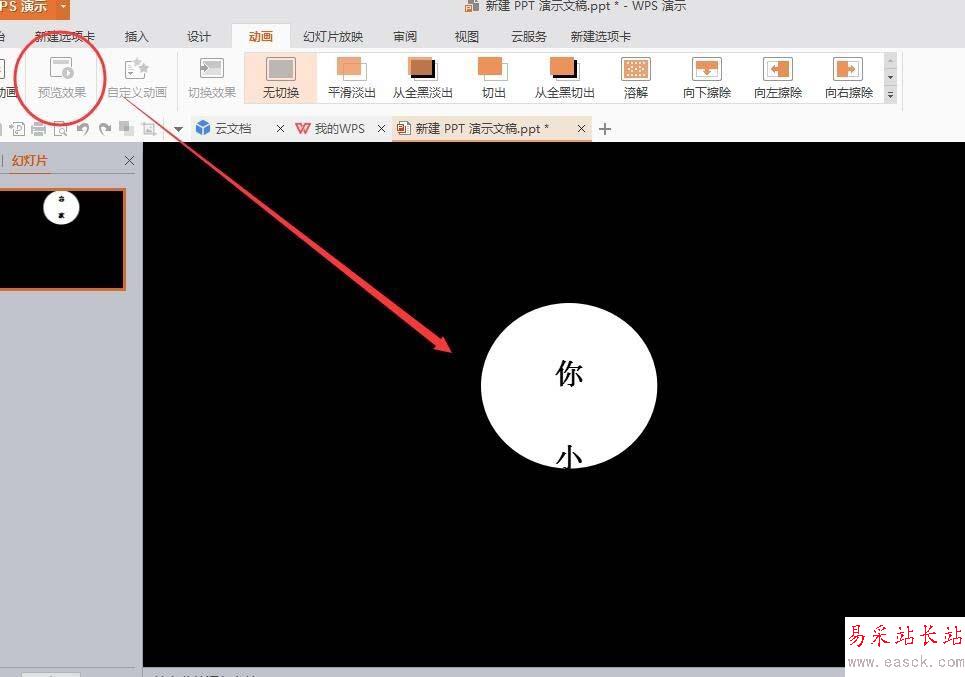 8、設置完畢之后,再點開菜單欄動畫里面的 預覽效果,就可以看到聚光燈的效果的,從上到下掃出你的主題文字來。