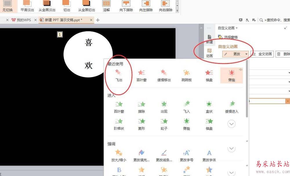 6、選中這個圓形,點擊菜單欄自定義動畫,設置一個動畫效果,我們選擇飛出效果,如圖