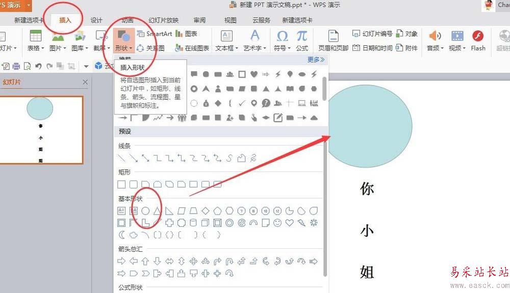 2、然后,在菜單欄插入形狀里面,插入一個圓形的形狀
