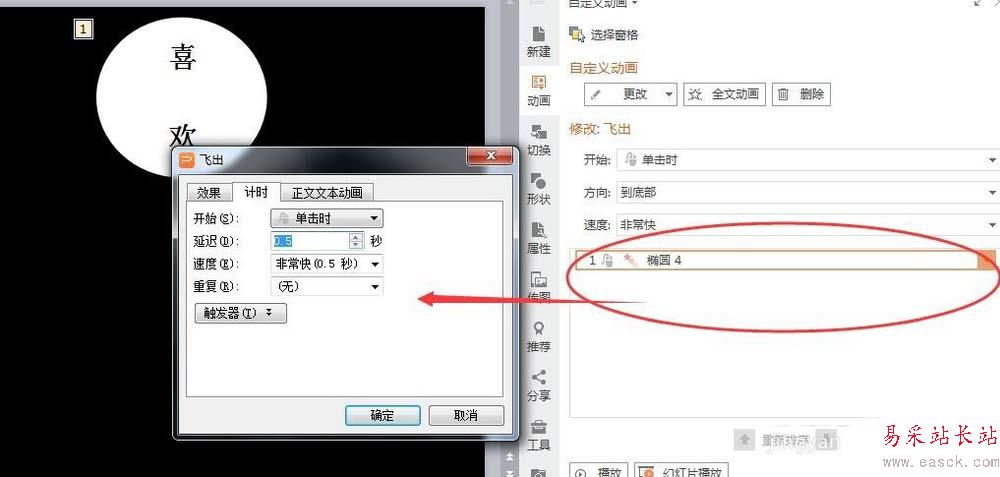 7、然后點擊這個設置好的飛出動畫效果,設置它的計時時間,如果想要快速的可以把它設置成0.5秒