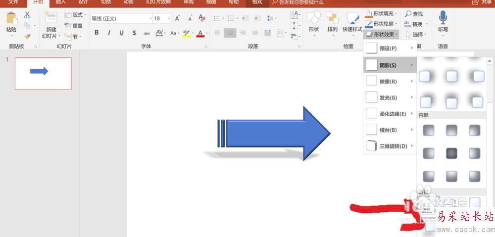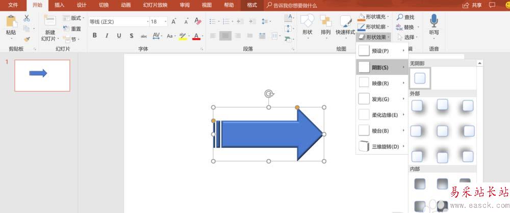 6、你還可以選擇形狀效果里面的陰影部分,記住一點要選中箭頭的框,就可以進行接下來的編輯。