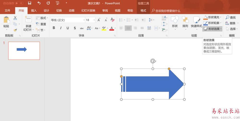 3、接下來你需要做的就是找到菜單欄里面的開始按鈕,隨后在右邊找到形狀效果的按鈕,點擊。
