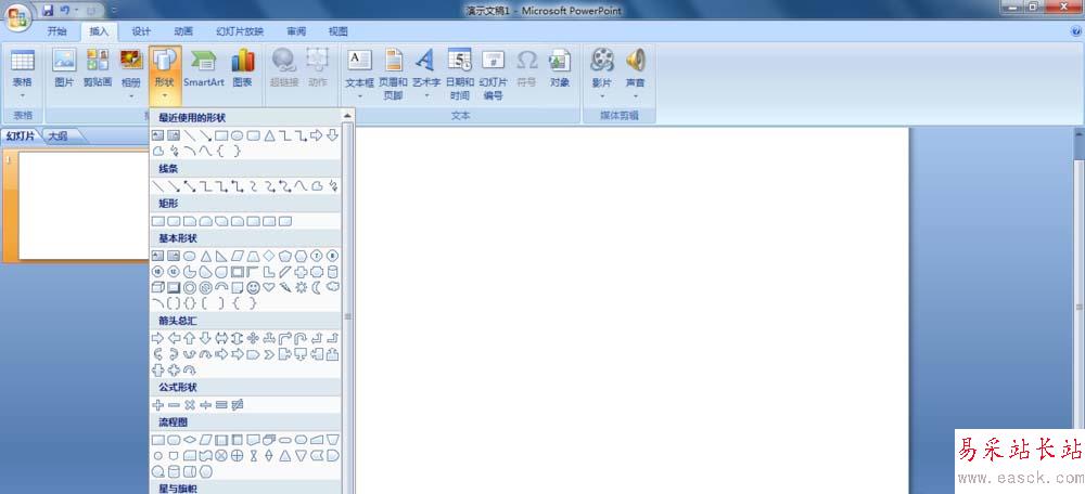 1、打開PPT2007,單擊“插入”選項卡,在“插圖”組中單擊“形狀”按鈕。