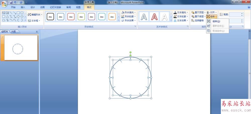 8、框選整個圖形,在打開的“格式”選項卡下,單擊“排列”組的“組合”按鈕,在彈出的選項中選擇“組合”。