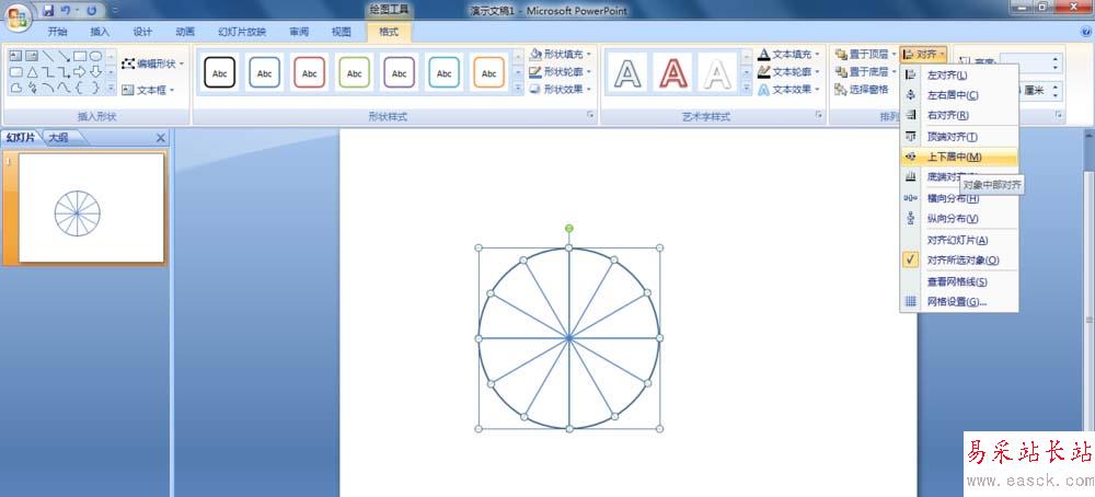 6、框選正圓及所有線段,在打開的“格式”選項卡下,單擊“排列”組的“對齊”按鈕,在彈出的下拉列表中分別選擇“左右居中”、“上下居中”。