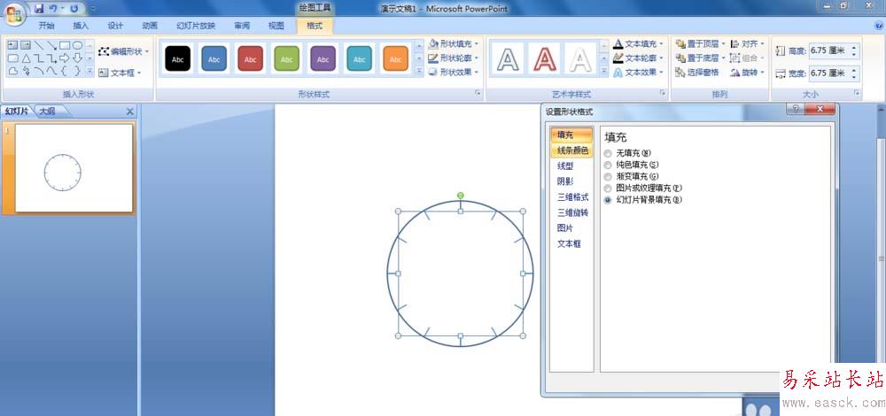7、再繪制一個小一點兒的正圓,和前面的圓形“左右居中”、“上下居中”對齊,然后右擊小圓,在彈出的快捷菜單中選擇“設置形狀格式”,在打開的對話框中設置 “填充:幻燈片背景填充”,“線條顏色:無線條”。