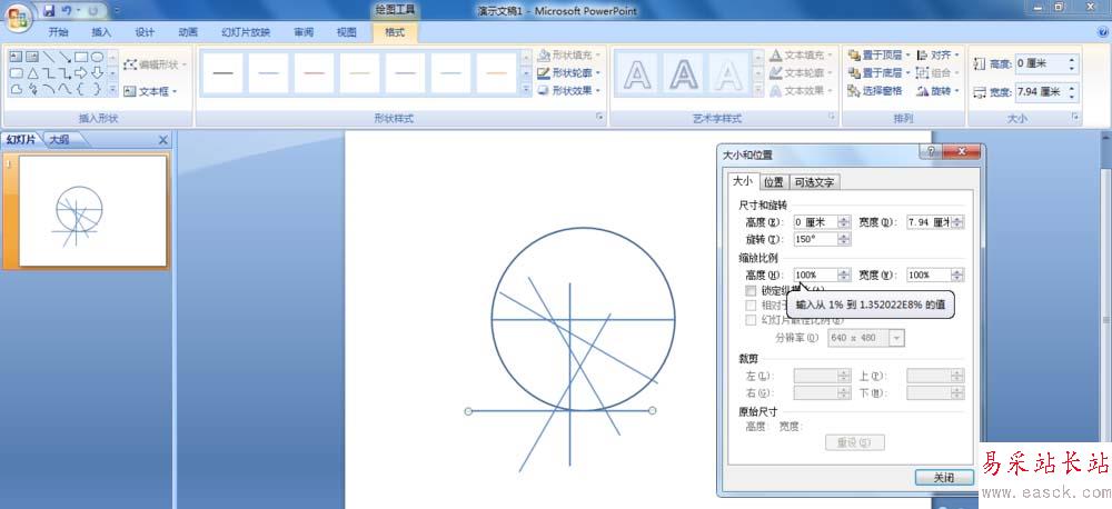 5、依次選中復制的線段,在打開的“格式”選項卡下,單擊“排列”組的“旋轉”按鈕,在彈出的下拉列表中選擇“其他旋轉選項”,在打開的對話框中分別設置旋轉30°、60°、90°、120°、150°。