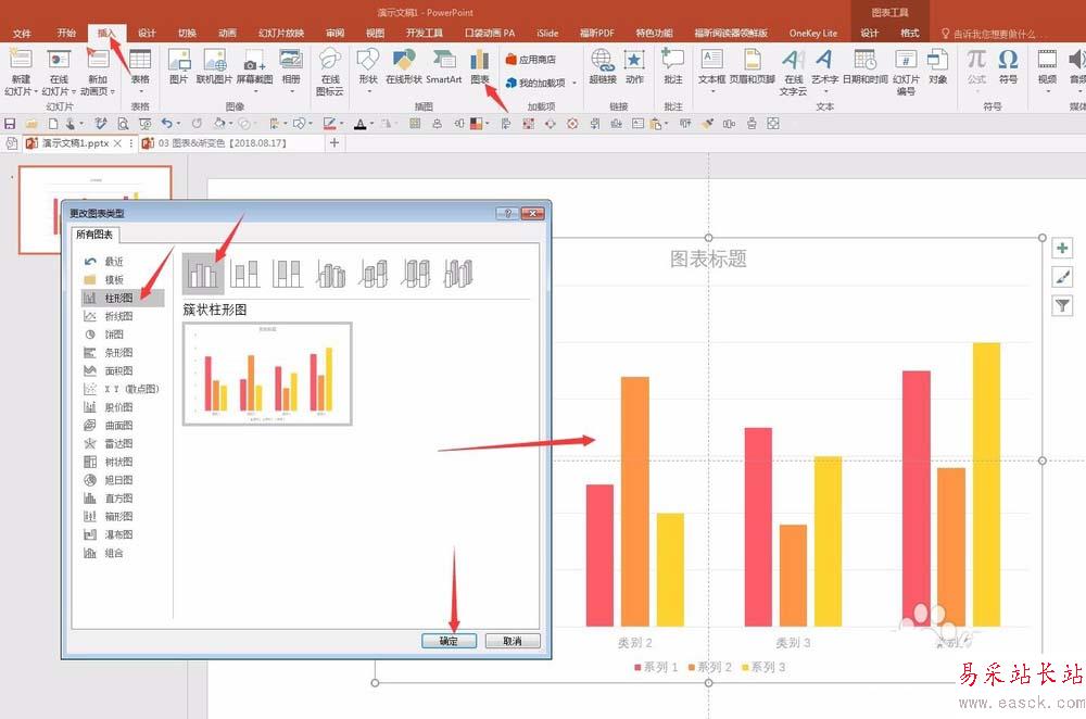 1、在ppt中插入數據圖,類型選擇“簇狀柱形圖”。