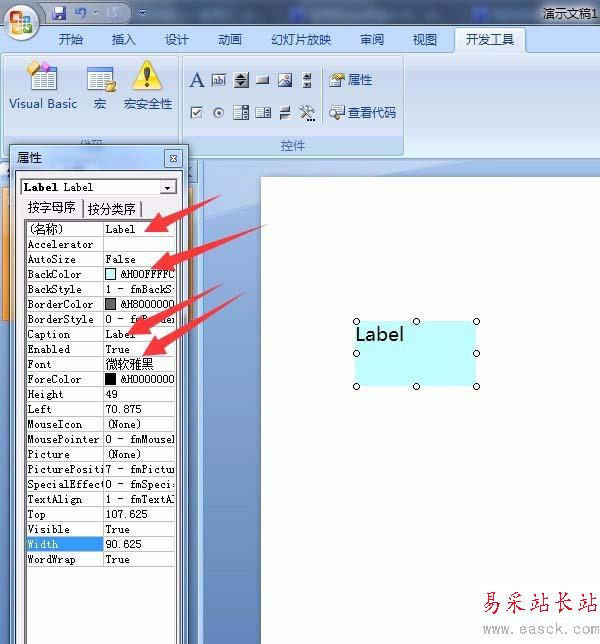 4、在繪圖區拉出標簽框,然后選中標簽,右鍵選擇屬性。名稱、Caption:改為label,并且更改標簽背景色、字體等。