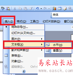 1、打開ppt,點擊“插入——文本框——水平”,當鼠標變成十字形時,按住鼠標左鍵,在ppt頁面上畫出文本框,并在文本框內輸入文字,調整文字的大小,文本框的位置。