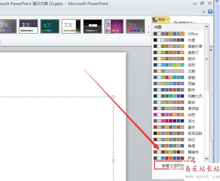 3、在“設計”的功能區,找到“顏色”,并且在顏色的下拉菜單找到“新建主題顏色”,如下圖所示。