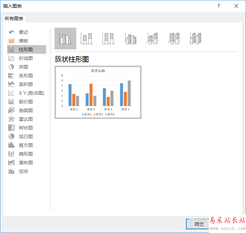 2、在“菜單欄”中找到“插入”,在插入的圖表區(qū)域選擇“圖表”,即可在彈出的對話框中選擇我們想要的數(shù)據(jù)類型,這次我們選擇的是默認(柱狀圖)