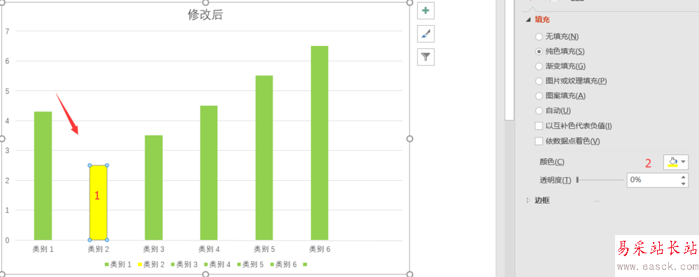 6、修改單一柱形圖顏色,在選擇圖表的基礎(chǔ)上,再次單擊我們想要更改顏色的柱形圖,選中它,最后修改顏色即可。