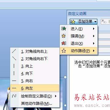6、選中右界邊緣外的圖片,點添加效果——動作路徑——向左。