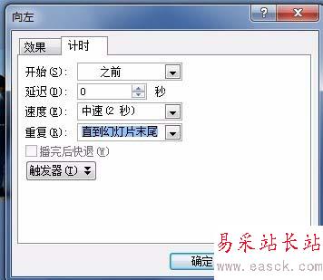 10、選擇計時選項卡,開始:選擇之前。速度:選擇合適的播放動畫的速度。重復:選擇直到幻燈片末尾,點確定。