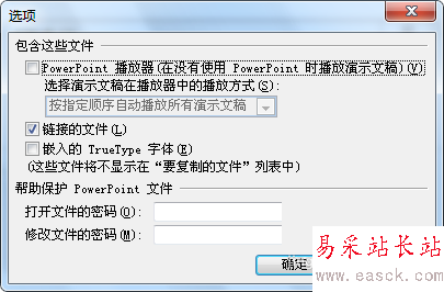 2、在選項種把Powerpoint播放器去掉,并勾選“鏈接的文件”,