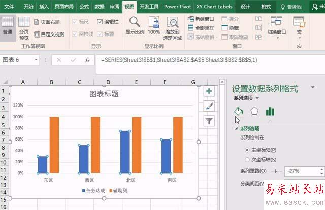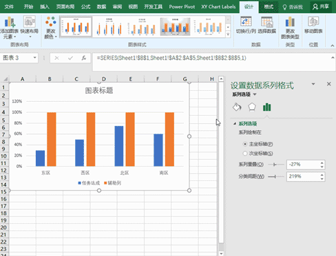 6、合并圖表。點擊系列選項,在系列重疊里輸入100%,然后瀟灑的回車(哈哈),兩個圖表就合并到一起啦。