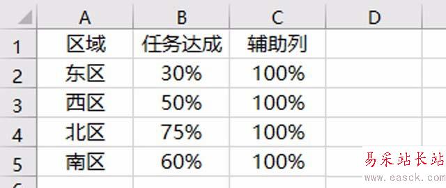 1、數據源準備。數據源中除了百分比數據,還需要一組輔助列,數值均為:100%。