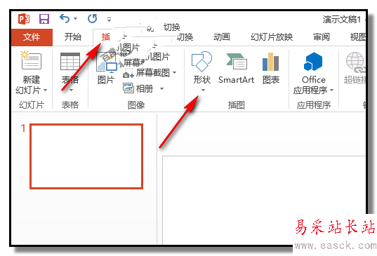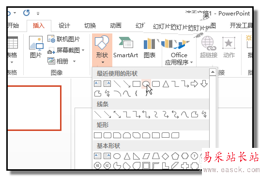 1、電腦啟動PPT軟件,新建幻燈片;比如,現在要把“百度經驗生活指南”制作成弧形,以印章的形式展示。開始操作:順序點擊:插入-形狀,看圖中箭頭所指。